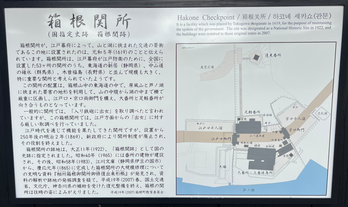 箱根関所は、江戸時代第一の主要道路である東海道を監視するために、設置された関所です。旅人が関所を通るには様ざまな検査が行われたんだそうです。その復元が、当時の匠の技や道具を使っておよそ150年の時を経て再び、芦ノ湖畔にあります。まるで江戸時代に迷いこんだようです。眺望豊かな立地場所はまさに、箱根芦ノ湖の旅の玄関口だったんですね。