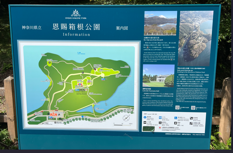 隣接するのが恩賜箱根公園。明治時代に皇族方の避暑や外国からのお客様を迎えるために建てられた「箱根離宮」跡地に広がる公園です。芦ノ湖と富士山の絶景ポイントとしても有名です。「かながわの景勝50選」の一つになっているんだそうです。